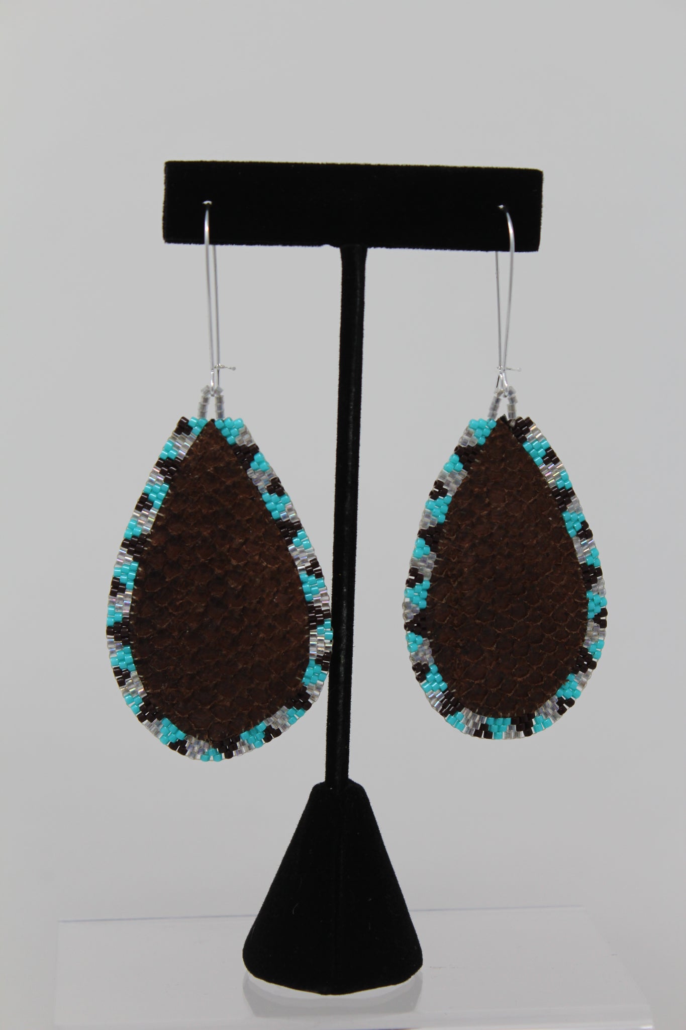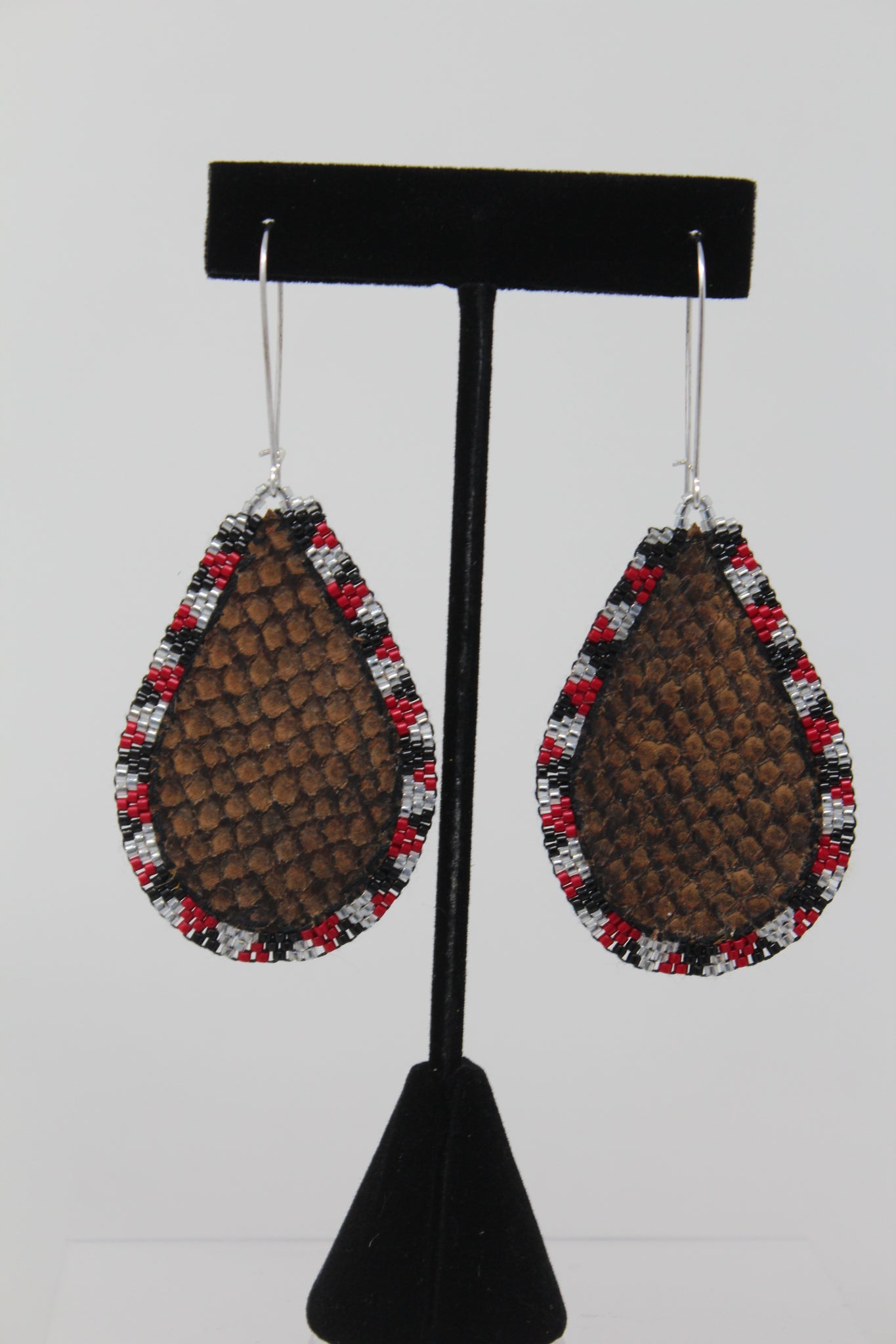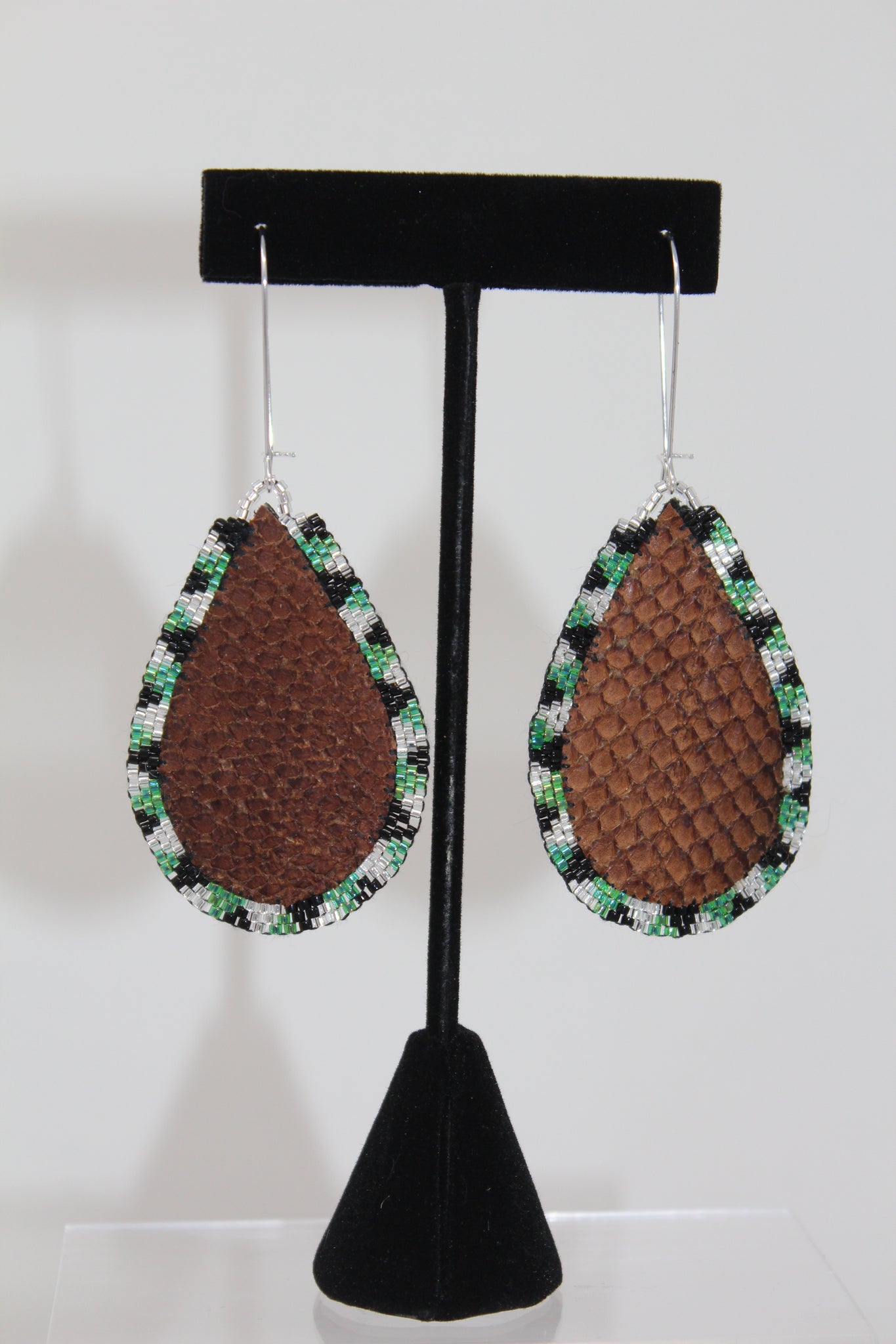 • Materials: thread, a variant of beads, tanned salmon skin, and earring hooks